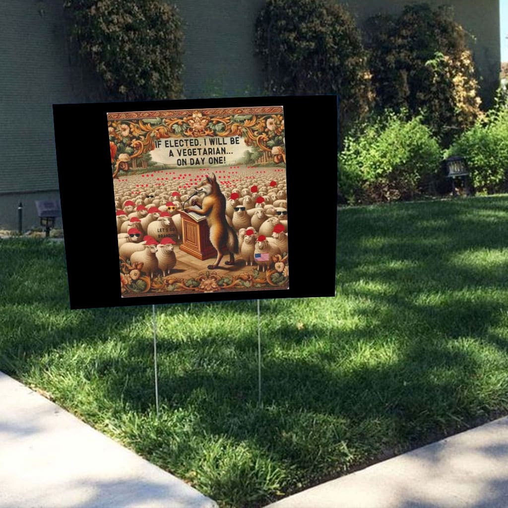 Make a bold statement this election season with “If Elected, I Will Be A Vegetarian… On Day One,” a hilarious and eye-catching yard sign perfect for expressing your political views with a touch of witty satire. This durable, weather-resistant corrugated plastic sign measures [insert dimensions, e.g., 18″ x 24″] and features vibrant, fade-resistant printing ensuring your message remains clear and legible throughout the campaign. The cleverly designed anti-MAGA message is sure to spark conversations and garner attention from neighbors and passersby, offering a unique and memorable way to showcase your political stance. More than just a sign, it’s a conversation starter, a symbol of your commitment to humor and political engagement, and a fun way to decorate your lawn while making a statement. Get yours today and let your yard do the talking!